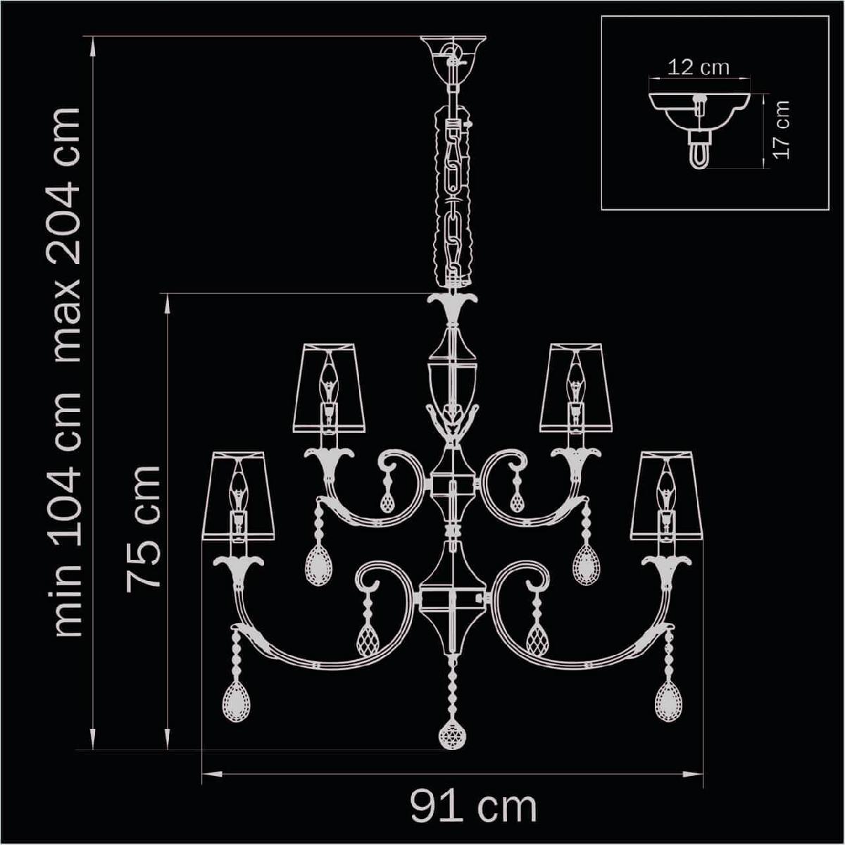 Производитель светильника рекомендует для устройства 15 ламп накаливания с цоколем E14 и мощностью 40 W, что позволит осветить помещение площадью 33,3 кв.м. Габариты изделия: высота – 2040 мм, диаметр – 910 мм.