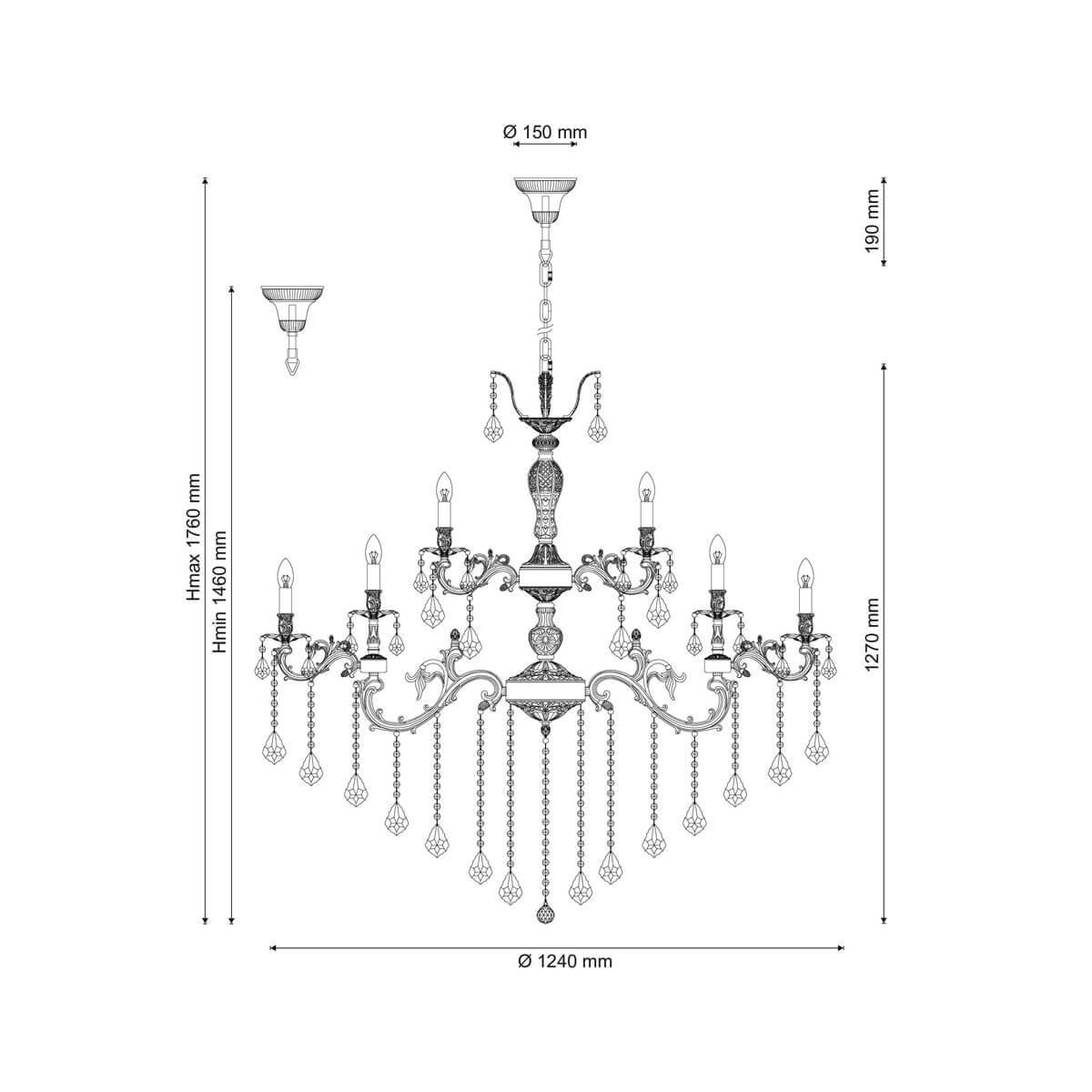 Производитель светильника рекомендует для устройства 30 ламп накаливания с цоколем E14 и мощностью 60 W, что позволит осветить помещение площадью 100,0 кв.м. Габариты изделия: высота – 1300 мм, диаметр – 1250 мм.