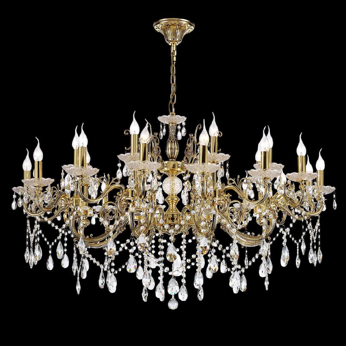 Производитель светильника рекомендует для устройства 24 ламп накаливания с цоколем E14 и мощностью 40 W, что позволит осветить помещение площадью 48 кв.м. Габариты изделия: высота – 800 мм, диаметр – 1250 мм.