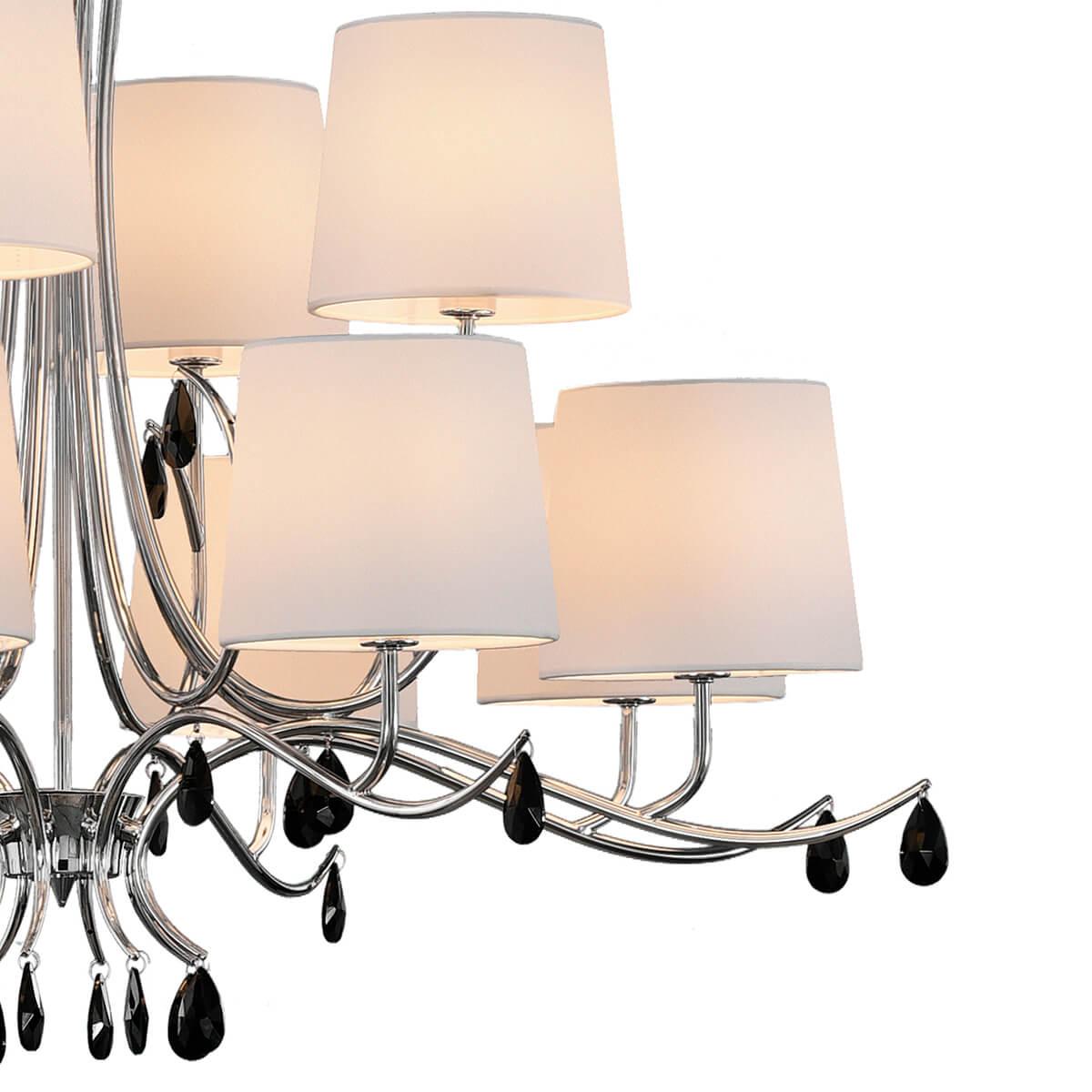Производитель светильника рекомендует для устройства 12 энергосберегающих ламп с цоколем E14 и мощностью 20 W, что позволит осветить помещение площадью кв.м. Габариты изделия: высота – 2000 мм, диаметр – 1000 мм.