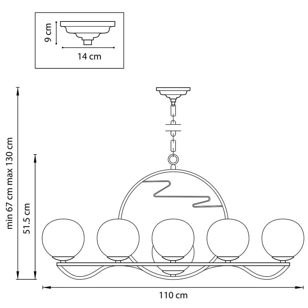 Производитель светильника рекомендует для устройства 11 ламп накаливания с цоколем E14 и мощностью 40 W, что позволит осветить помещение площадью кв.м. Габариты изделия: высота – 515 мм, диаметр – 1100 мм.