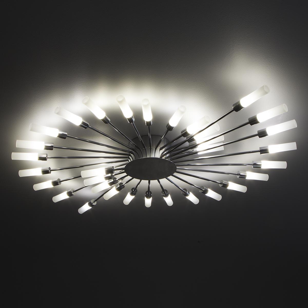 Производитель светильника рекомендует для устройства 32 галогеновых ламп с цоколем G4 и мощностью 3 W, что позволит осветить помещение площадью 30 кв.м. Габариты изделия: высота – 95 мм, диаметр – мм.