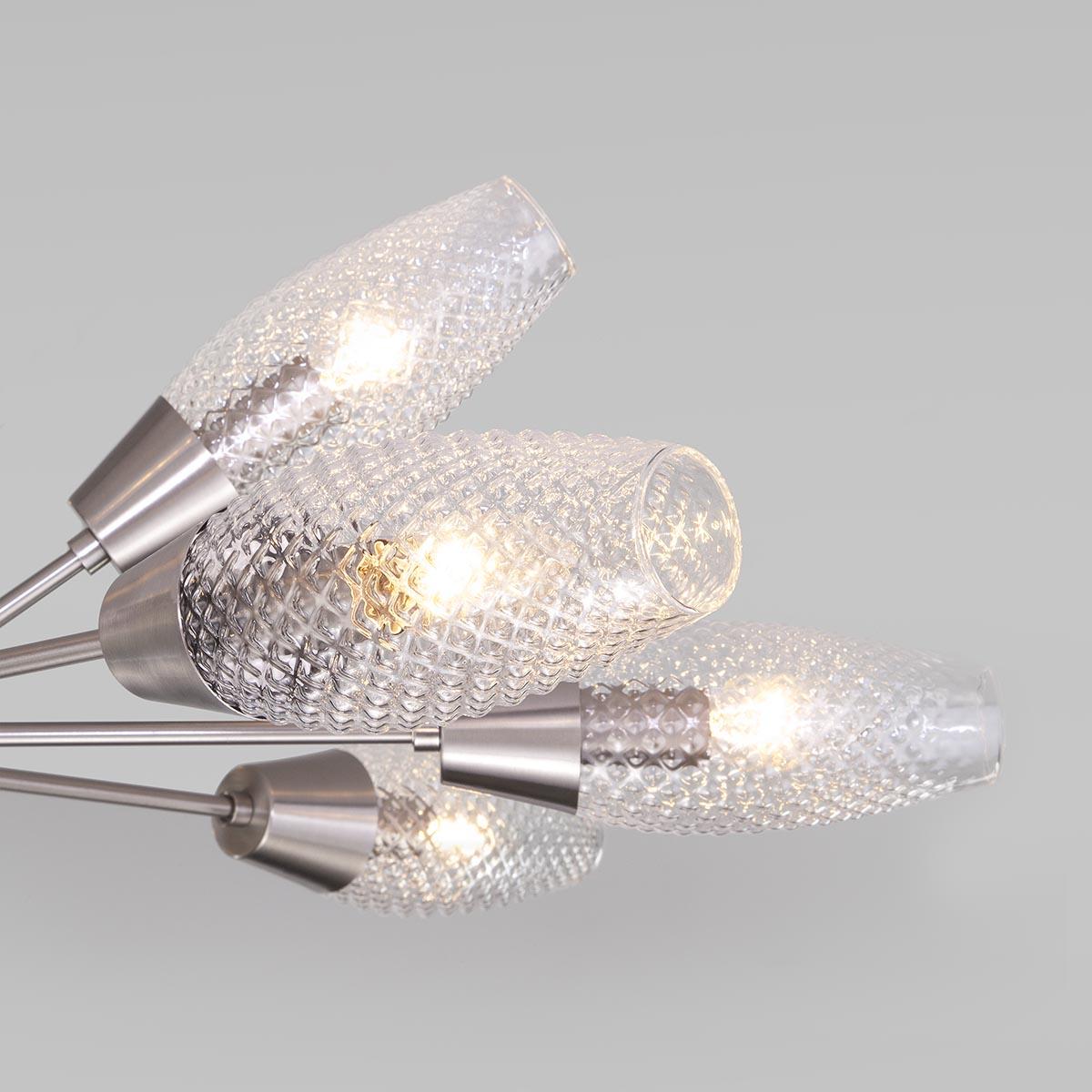 Подвесная люстра Eurosvet Thalia 60140/12 сатин-никель от Китайского бренда из коллекции Thalia будет удачно смотреться в гостиной в ретро стиле. Светильник выполнен из стекла с плафонами в форме прозрачного цвета.