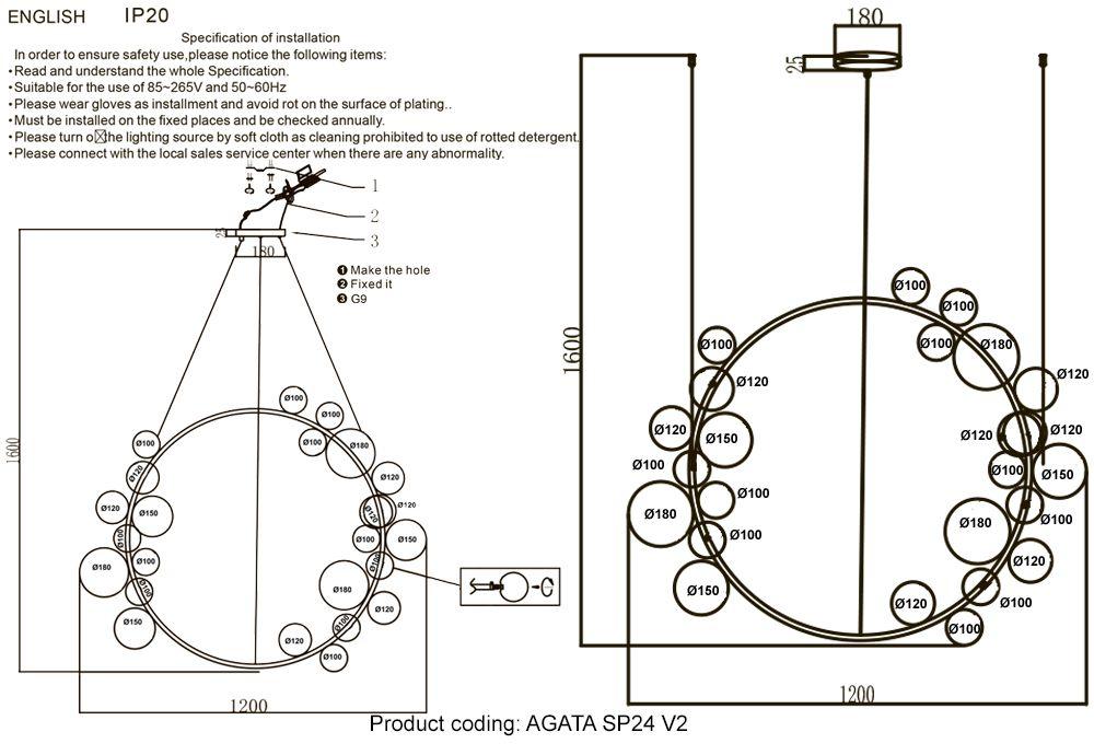 Производитель светильника рекомендует для устройства 24 светодиодных ламп с цоколем G9 и мощностью 5 W, что позволит осветить помещение площадью кв.м. Габариты изделия: высота – 1600 мм, диаметр – 1200 мм.