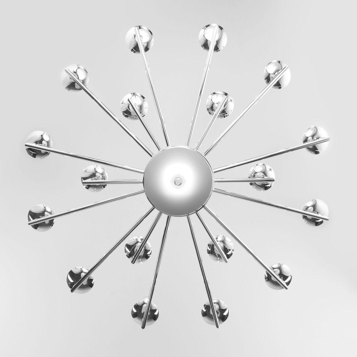 Производитель светильника рекомендует для устройства 18 ламп накаливания с цоколем E14 и мощностью 60 W, что позволит осветить помещение площадью 32 кв.м. Габариты изделия: высота – 700 мм, диаметр – 900 мм.