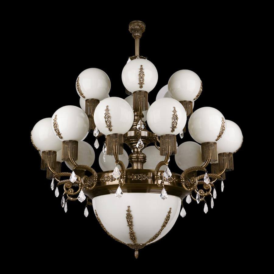 Производитель светильника рекомендует для устройства 24 ламп накаливания с цоколем E27 и мощностью 40 W, что позволит осветить помещение площадью кв.м. Габариты изделия: высота – 1300 мм, диаметр – 1200 мм.