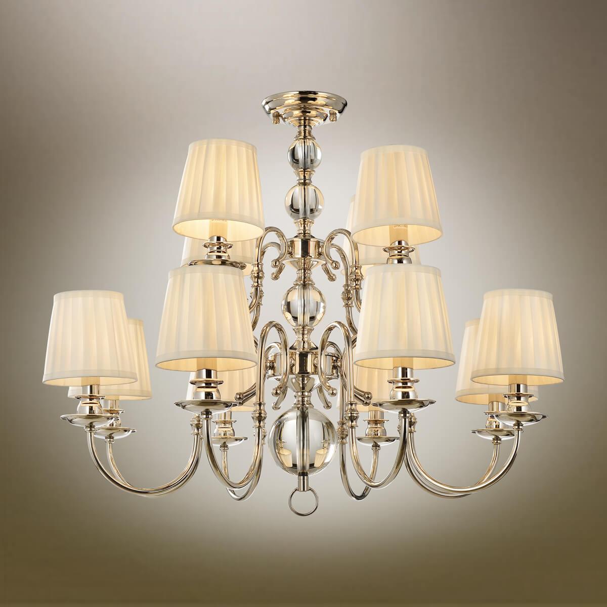 Производитель светильника рекомендует для устройства 12 ламп накаливания с цоколем E14 и мощностью 40 W, что позволит осветить помещение площадью 27 кв.м. Габариты изделия: высота – 720 мм, диаметр – 900 мм.