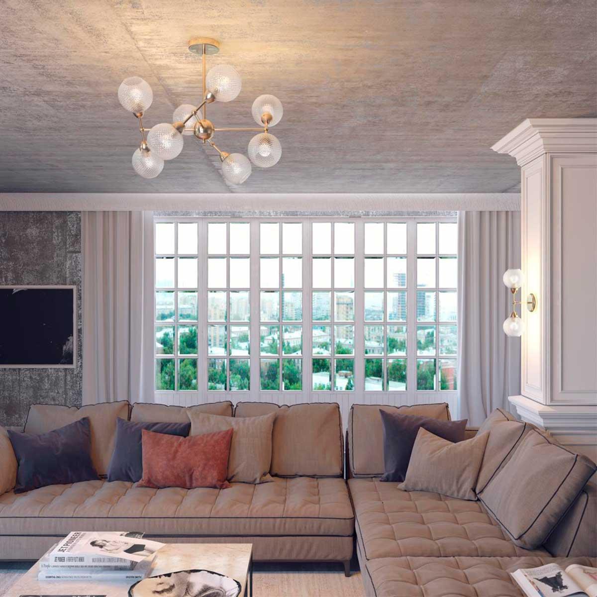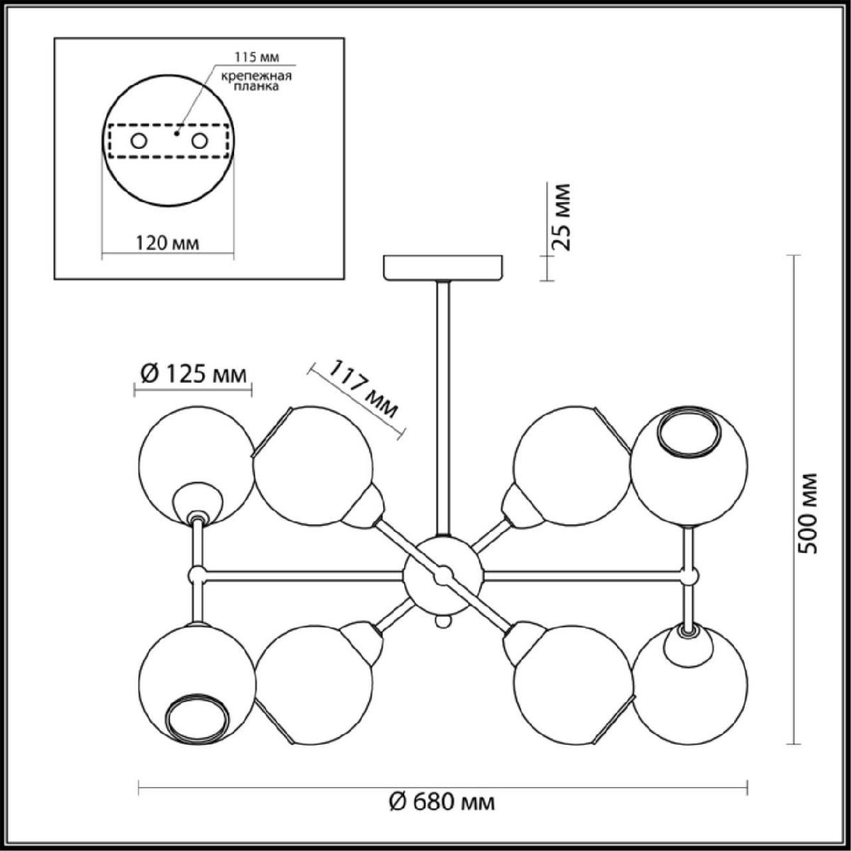 Производитель светильника рекомендует для устройства 8 ламп накаливания с цоколем E14 и мощностью 40 W, что позволит осветить помещение площадью кв.м. Габариты изделия: высота – 500 мм, диаметр – 680 мм.