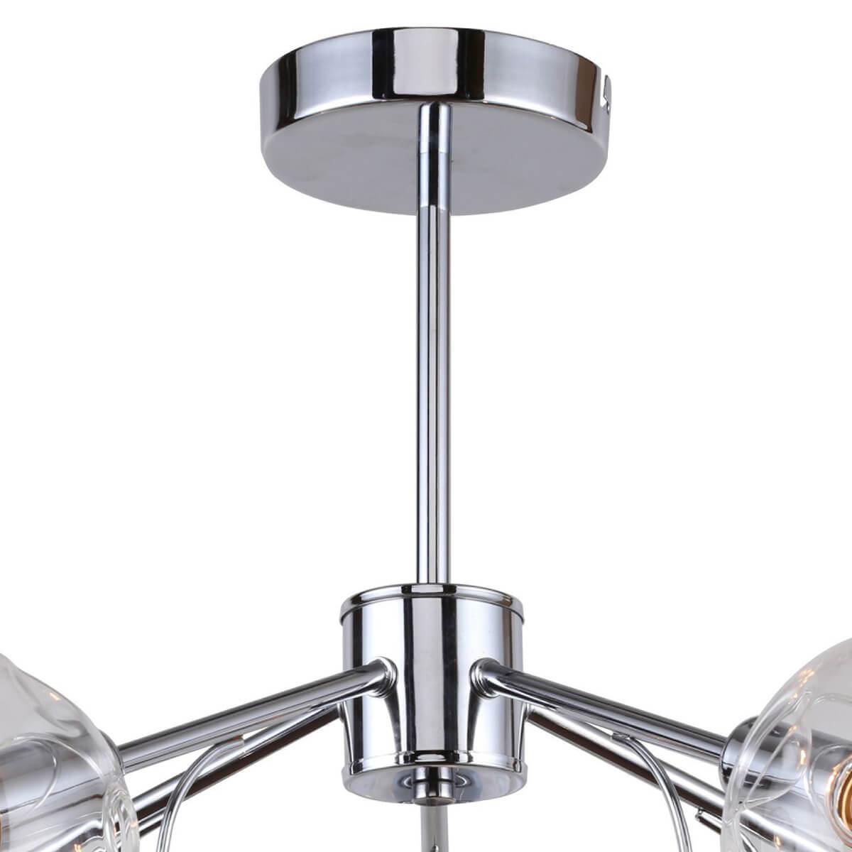 Производитель светильника рекомендует для устройства 5 ламп накаливания с цоколем E14 и мощностью 40 W, что позволит осветить помещение площадью 11,1 кв.м. Габариты изделия: высота – 345 мм, диаметр – 610 мм.