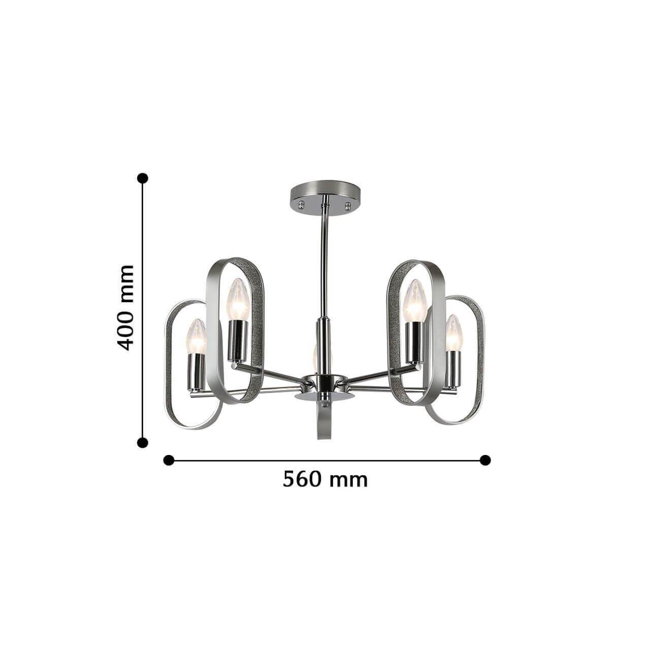 Производитель светильника рекомендует для устройства 5 ламп накаливания с цоколем E14 и мощностью 40 W, что позволит осветить помещение площадью 11,1 кв.м. Габариты изделия: высота – 400 мм, диаметр – 560 мм.