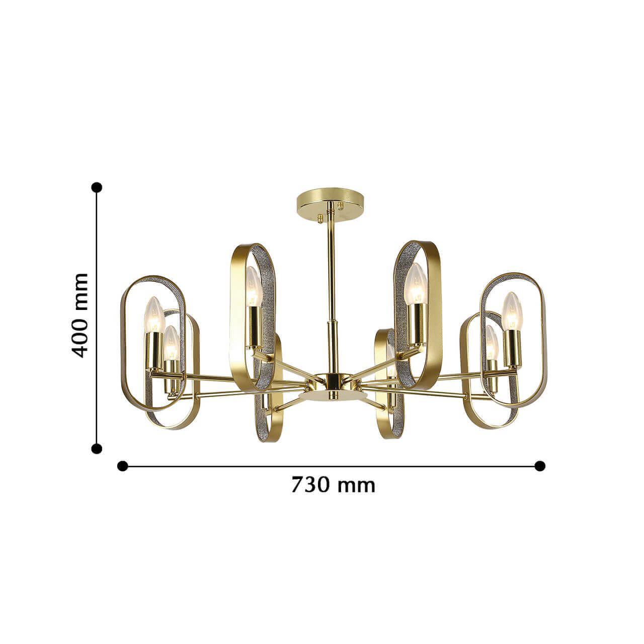 Производитель светильника рекомендует для устройства 8 ламп накаливания с цоколем E14 и мощностью 40 W, что позволит осветить помещение площадью 17,8 кв.м. Габариты изделия: высота – 400 мм, диаметр – 730 мм.