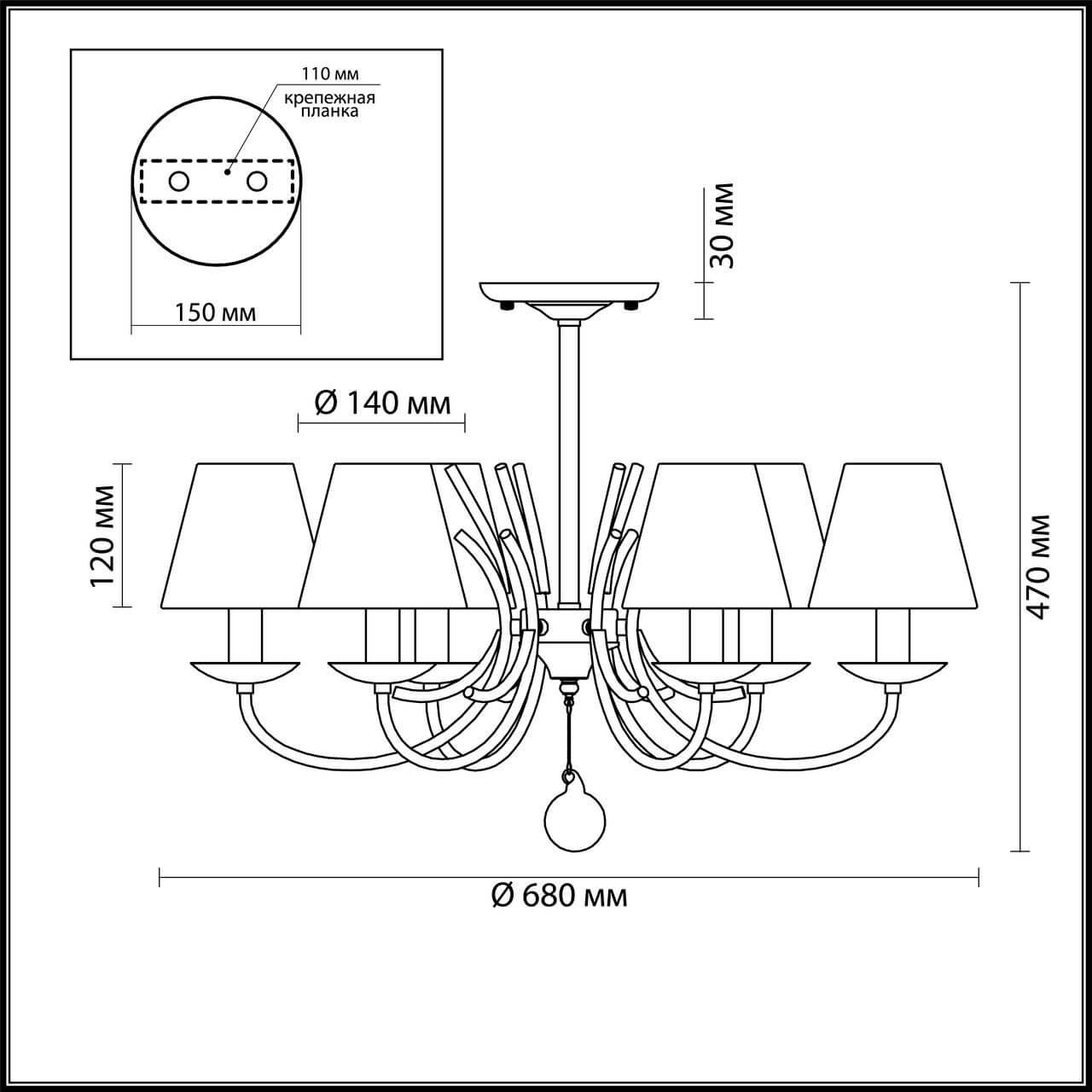 Производитель светильника рекомендует для устройства 6 ламп накаливания с цоколем E14 и мощностью 40 W, что позволит осветить помещение площадью кв.м. Габариты изделия: высота – 470 мм, диаметр – 680 мм.