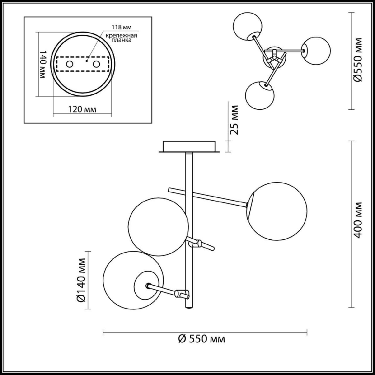 Производитель светильника рекомендует для устройства 3 лампы накаливания с цоколем E14 и мощностью 60 W, что позволит осветить помещение площадью кв.м. Габариты изделия: высота – 400 мм, диаметр – 550 мм.