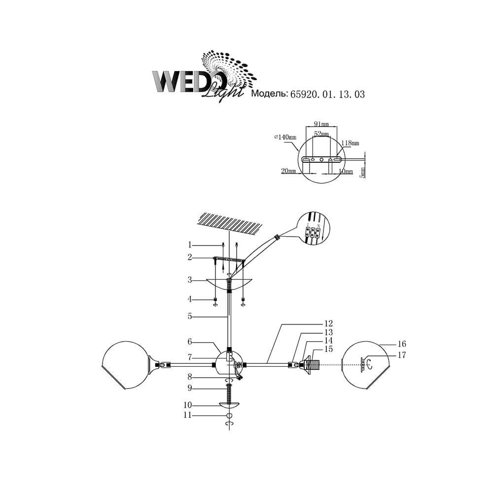 Производитель светильника рекомендует для устройства 3 лампы накаливания с цоколем E27 и мощностью 60 W, что позволит осветить помещение площадью 9 кв.м. Габариты изделия: высота – 320 мм, диаметр – 750 мм.