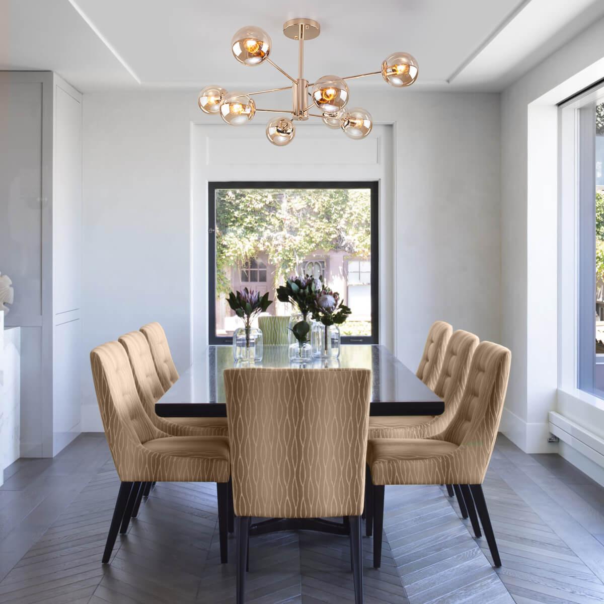 Производитель светильника рекомендует для устройства 8 ламп накаливания с цоколем E27 и мощностью 60 W, что позволит осветить помещение площадью 26 кв.м. Габариты изделия: высота – 530 мм, диаметр – 750 мм.