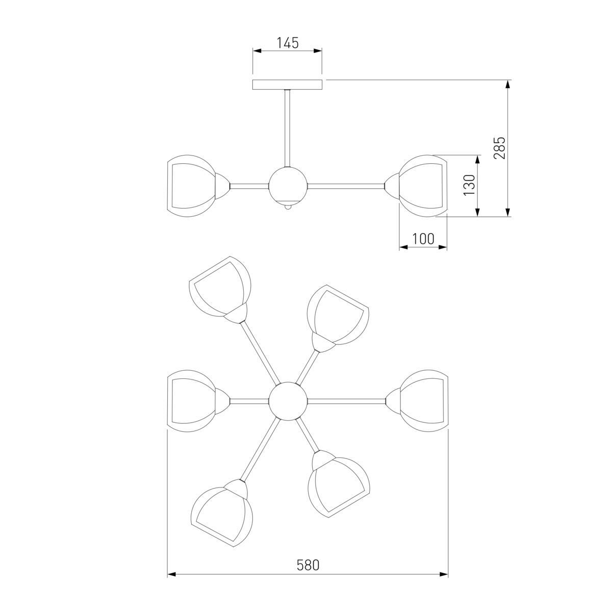 Производитель светильника рекомендует для устройства 6 ламп накаливания с цоколем E27 и мощностью 40 W, что позволит осветить помещение площадью 13,3 кв.м. Габариты изделия: высота – 290 мм, диаметр – 680 мм.