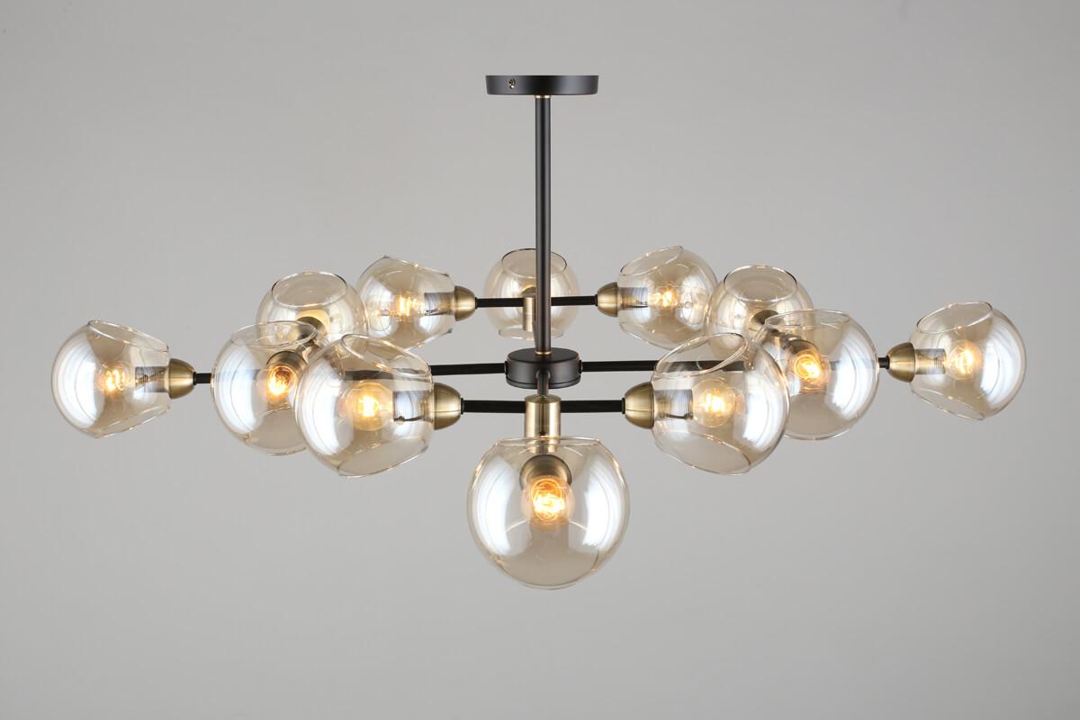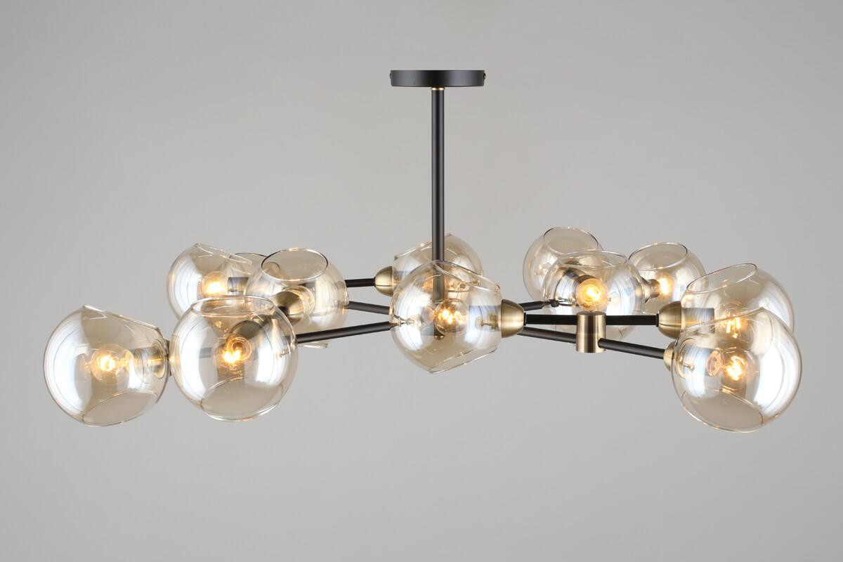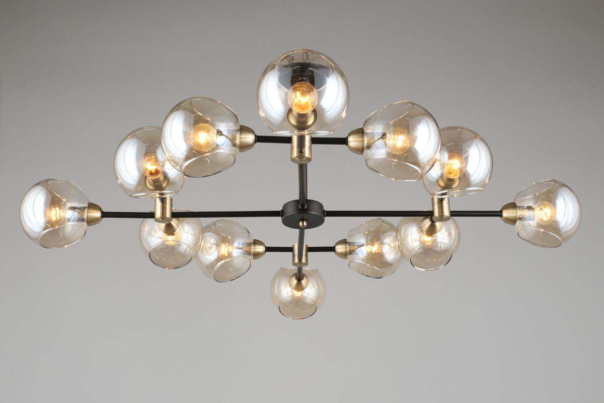 Производитель светильника рекомендует для устройства 12 ламп накаливания с цоколем E14 и мощностью 40 W, что позволит осветить помещение площадью 26 кв.м. Габариты изделия: высота – 440 мм, диаметр – 1040 мм.
