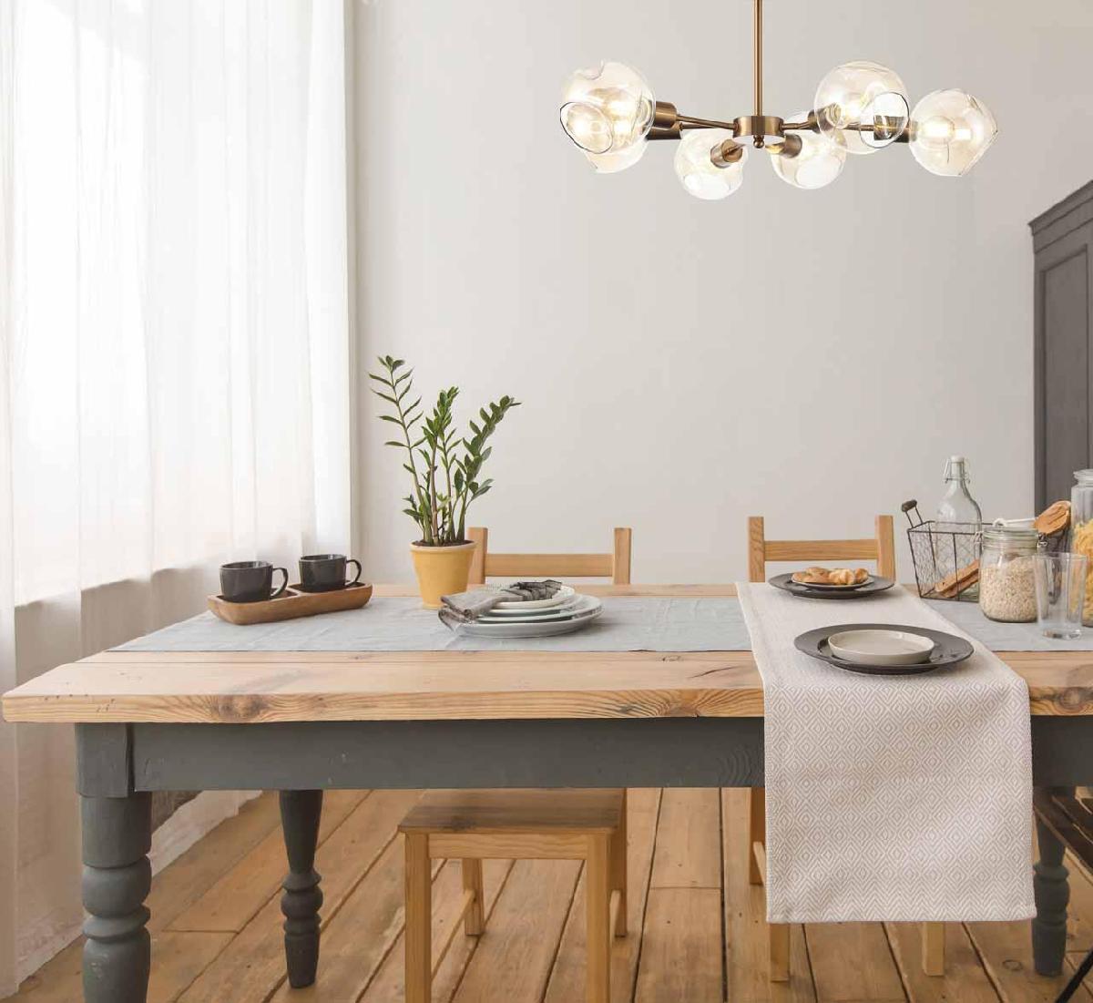 Производитель светильника рекомендует для устройства 6 ламп накаливания с цоколем E14 и мощностью 60 W, что позволит осветить помещение площадью 20 кв.м. Габариты изделия: высота – 355 мм, диаметр – 650 мм.