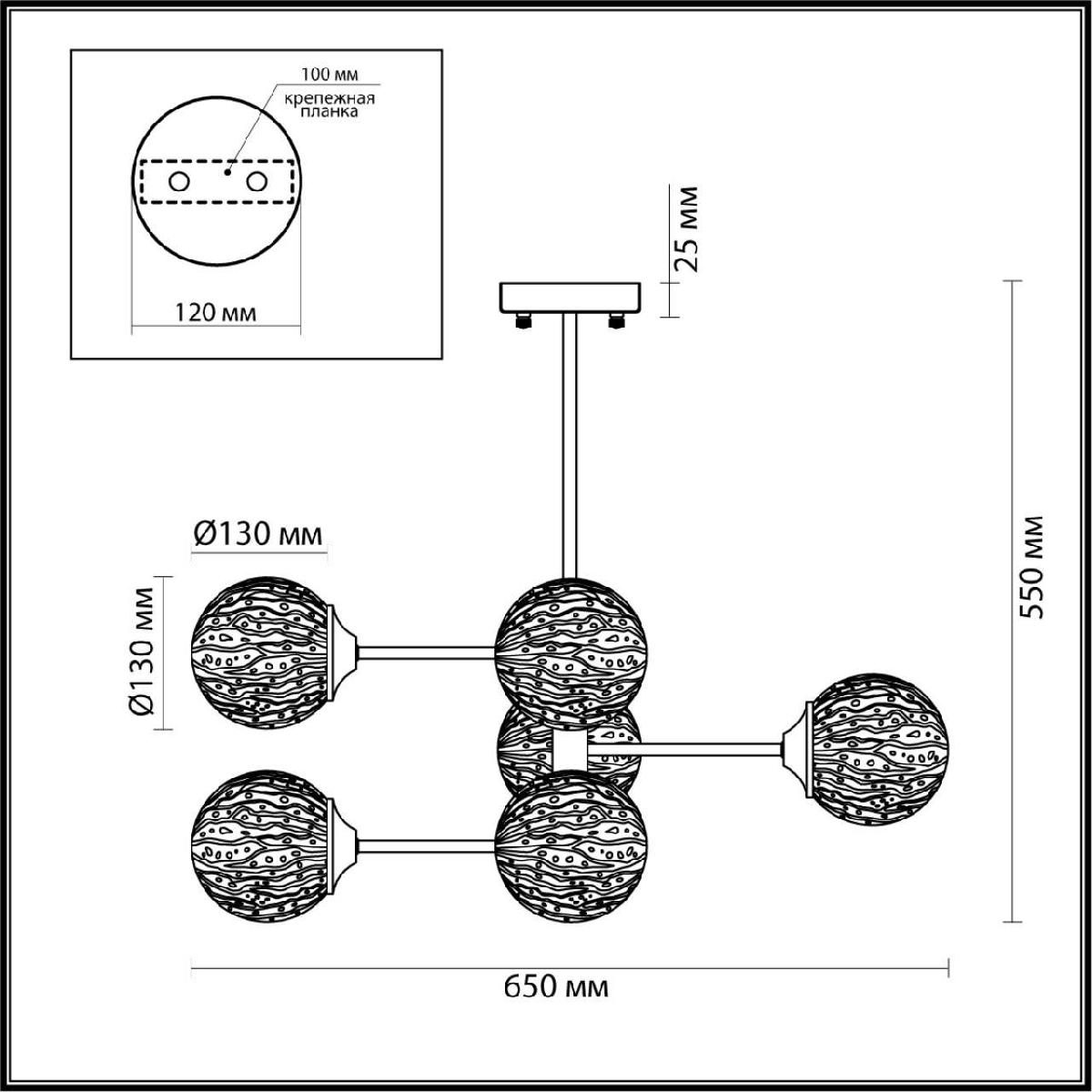 Производитель светильника рекомендует для устройства 6 ламп накаливания с цоколем E27 и мощностью 60 W, что позволит осветить помещение площадью 20 кв.м. Габариты изделия: высота – 550 мм, диаметр – 650 мм.