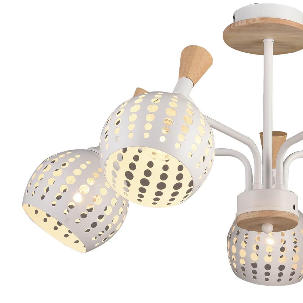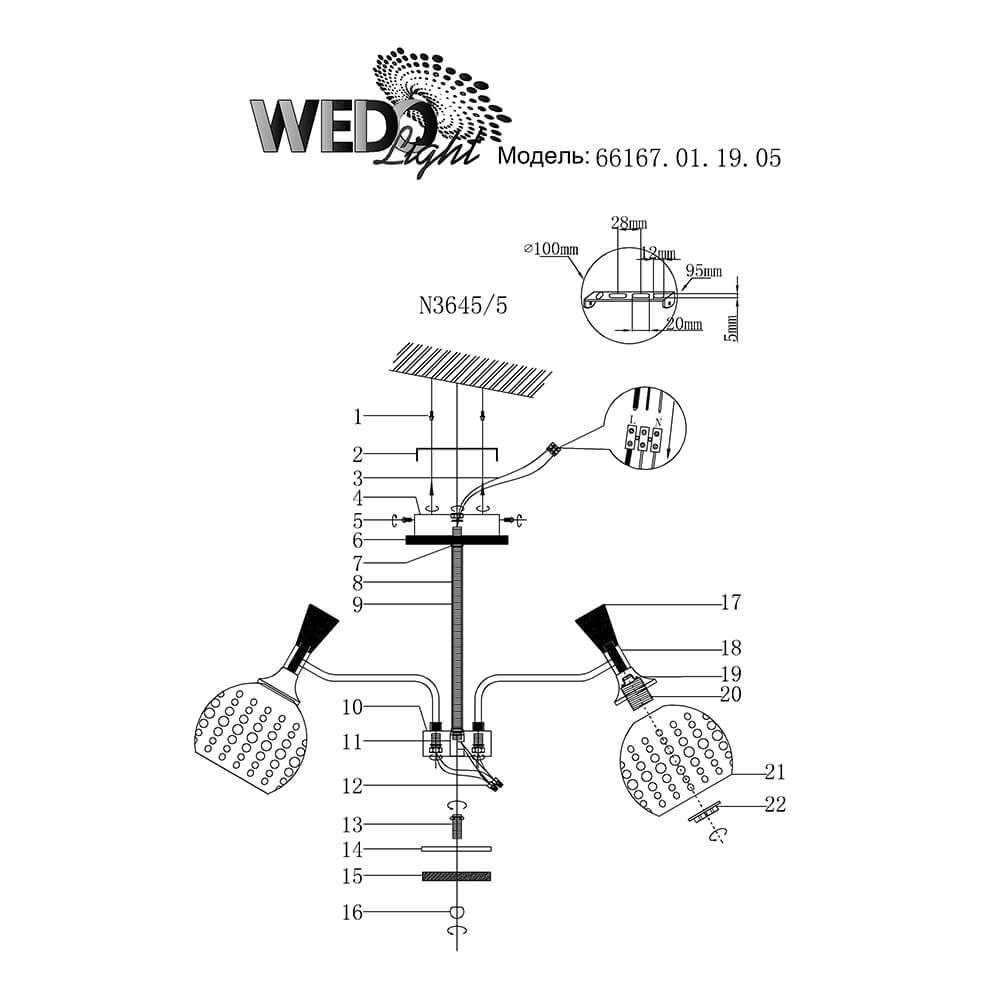 Производитель светильника рекомендует для устройства 5 ламп накаливания с цоколем E27 и мощностью 60 W, что позволит осветить помещение площадью 16,7 кв.м. Габариты изделия: высота – 330 мм, диаметр – 620 мм.