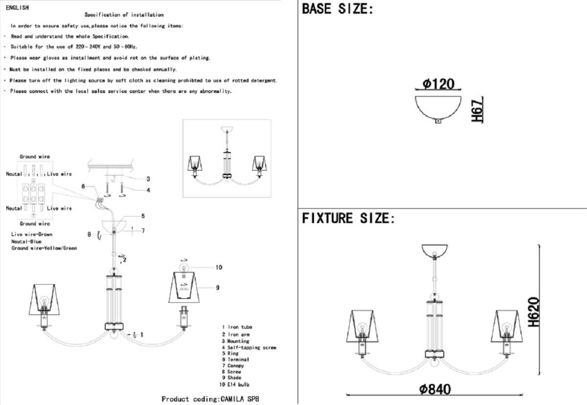 Производитель светильника рекомендует для устройства 8 ламп накаливания с цоколем E14 и мощностью 60 W, что позволит осветить помещение площадью 26,7 кв.м. Габариты изделия: высота – 620 мм, диаметр – 840 мм.