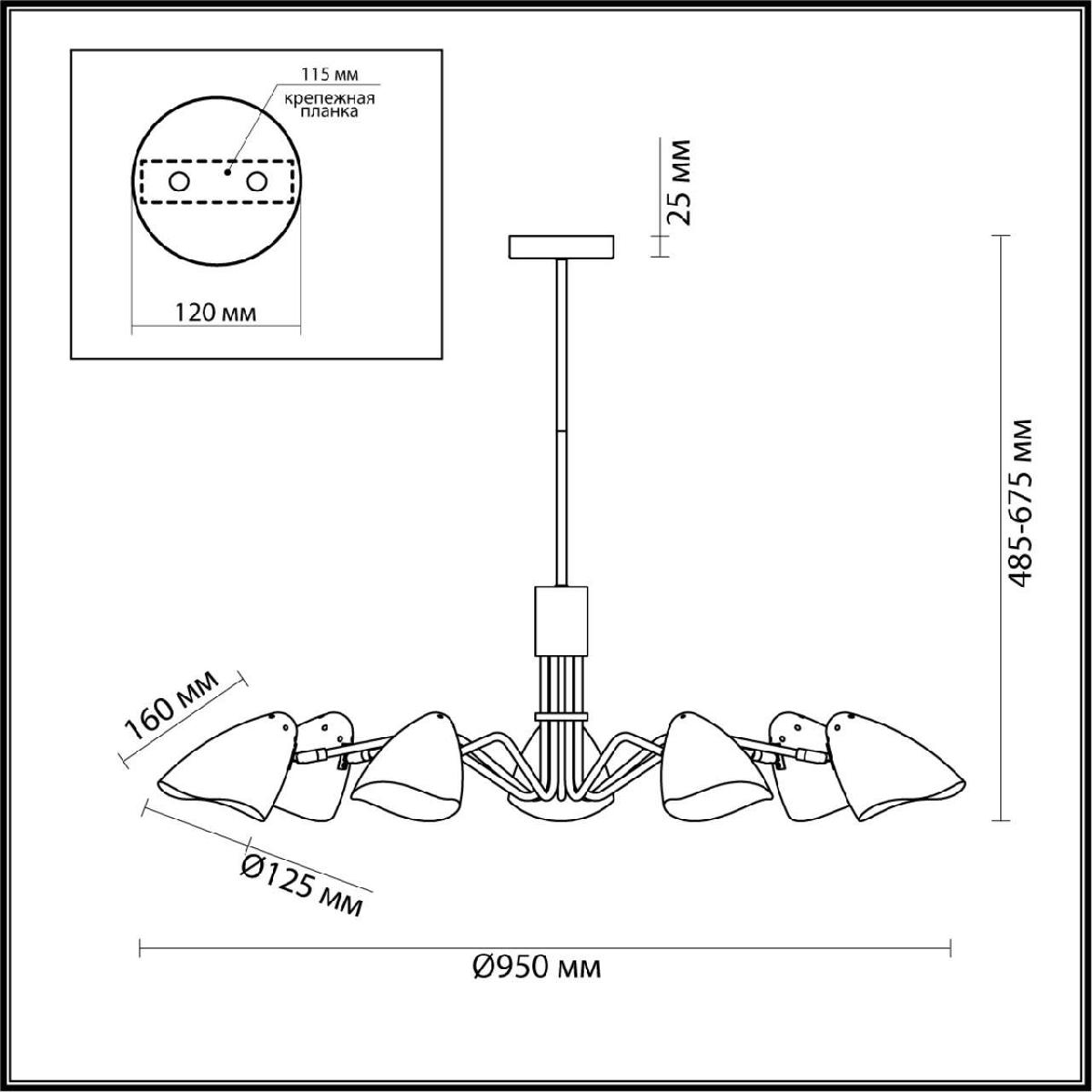 Производитель светильника рекомендует для устройства 7 ламп накаливания с цоколем E14 и мощностью 40 W, что позволит осветить помещение площадью 15,6 кв.м. Габариты изделия: высота – 485 мм, диаметр – 950 мм.