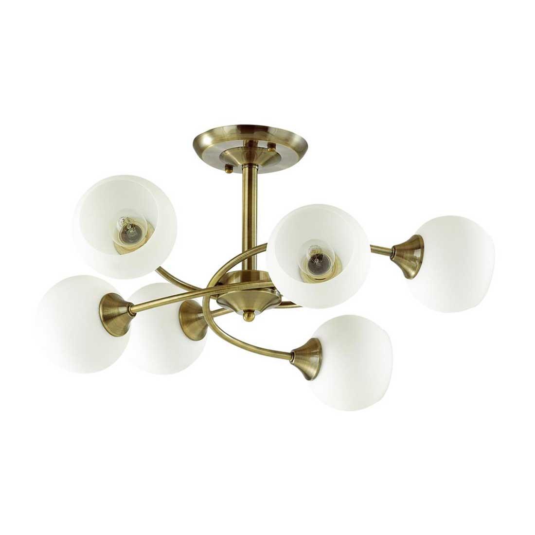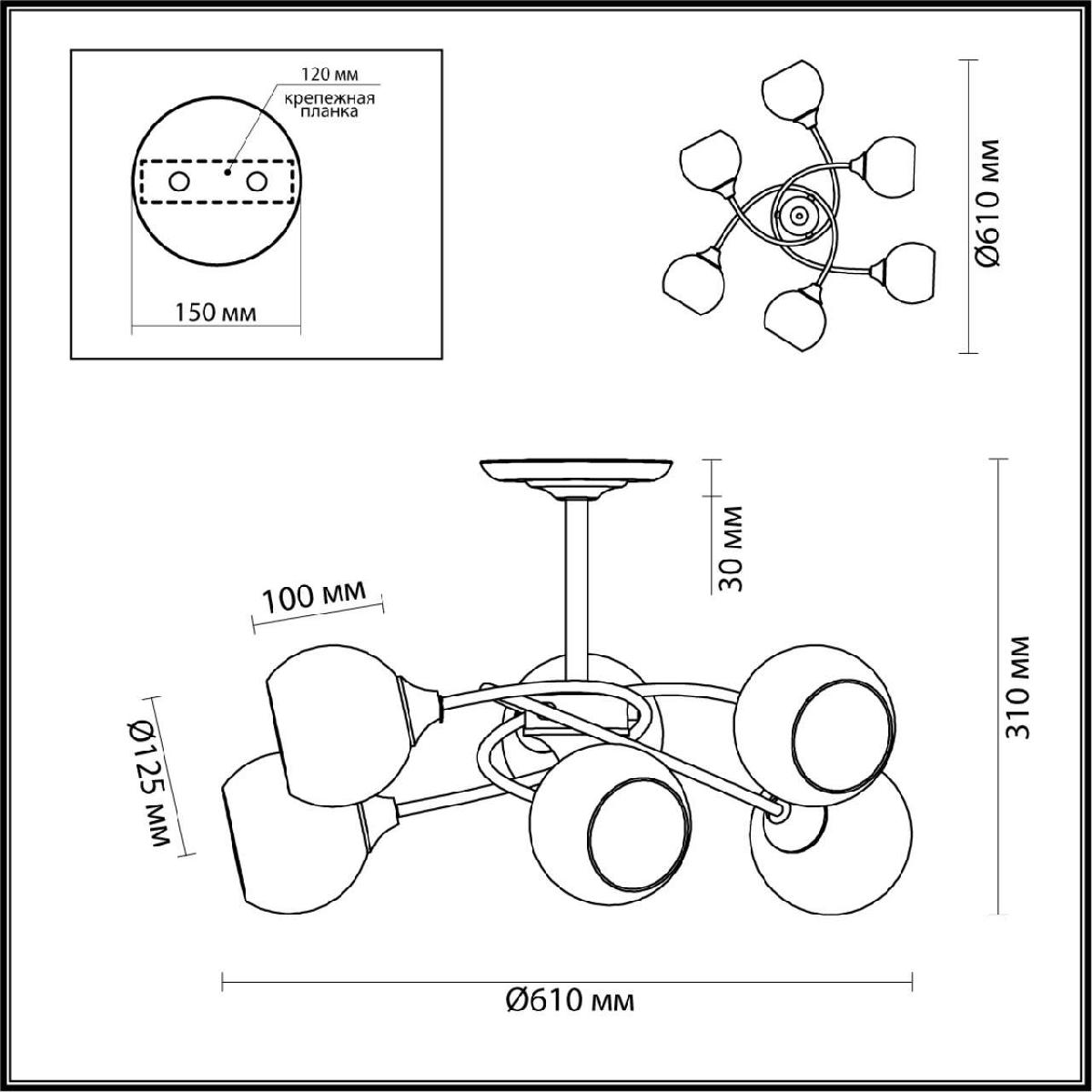 Производитель светильника рекомендует для устройства 6 ламп накаливания с цоколем E27 и мощностью 60 W, что позволит осветить помещение площадью 20 кв.м. Габариты изделия: высота – 310 мм, диаметр – 610 мм.