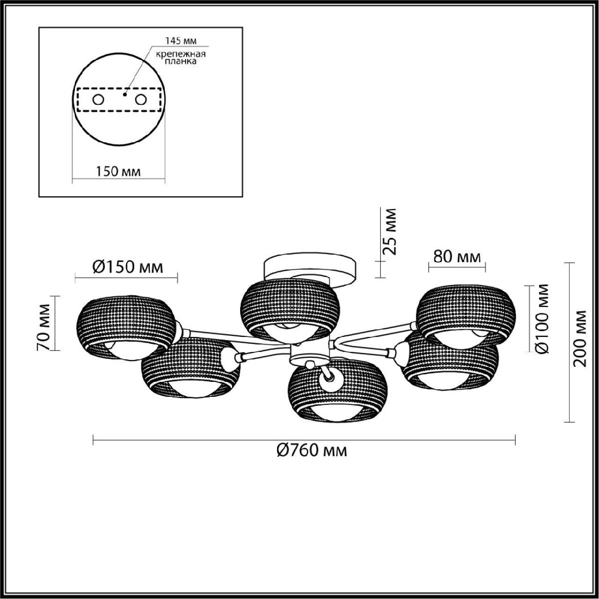 Производитель светильника рекомендует для устройства 6 ламп накаливания с цоколем E14 и мощностью 40 W, что позволит осветить помещение площадью 13,3 кв.м. Габариты изделия: высота – 200 мм, диаметр – 760 мм.