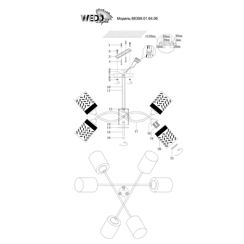 Производитель светильника рекомендует для устройства 6 ламп накаливания с цоколем E27 и мощностью 60 W, что позволит осветить помещение площадью 20 кв.м. Габариты изделия: высота – 430 мм, диаметр – 620 мм.