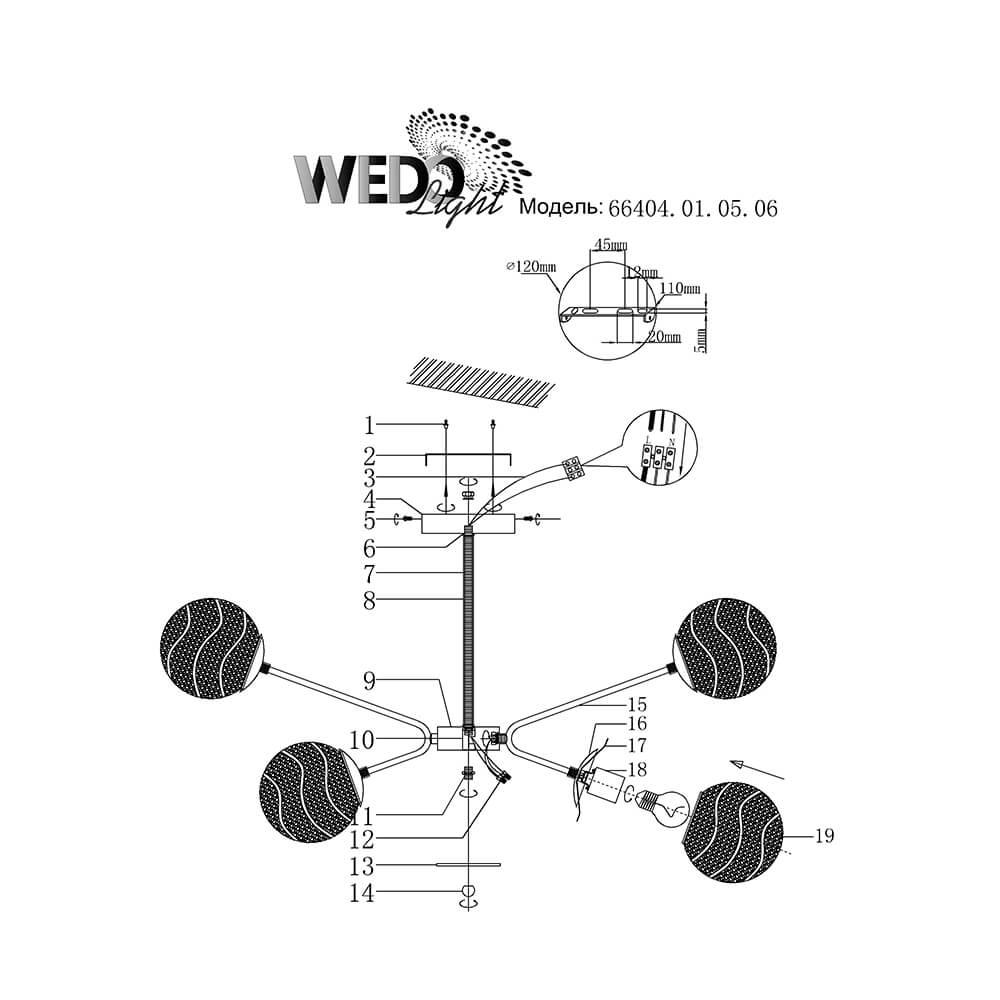 Производитель светильника рекомендует для устройства 6 ламп накаливания с цоколем E27 и мощностью 60 W, что позволит осветить помещение площадью 20 кв.м. Габариты изделия: высота – 450 мм, диаметр – 790 мм.