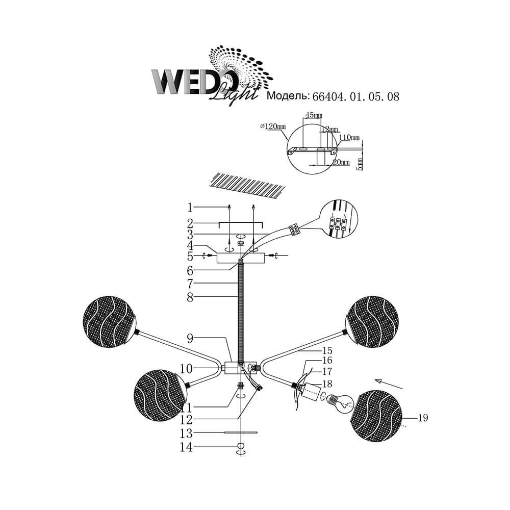 Производитель светильника рекомендует для устройства 8 ламп накаливания с цоколем E27 и мощностью 60 W, что позволит осветить помещение площадью 26,7 кв.м. Габариты изделия: высота – 450 мм, диаметр – 790 мм.