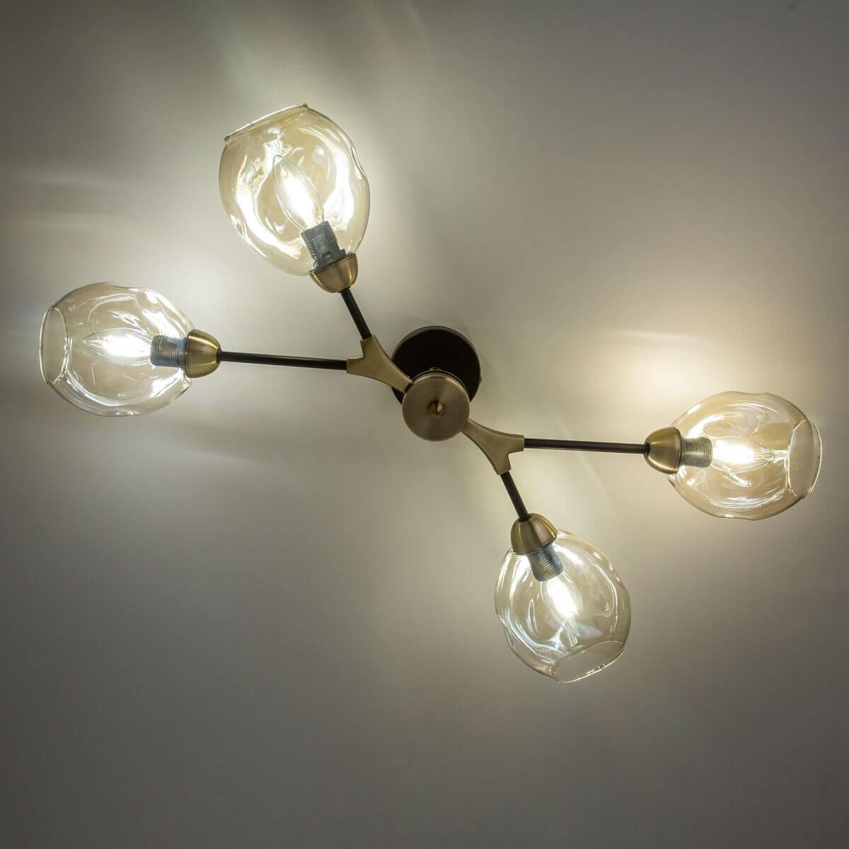 Производитель светильника рекомендует для устройства 4 лампы накаливания с цоколем E14 и мощностью 40 W, что позволит осветить помещение площадью 8,9 кв.м. Габариты изделия: высота – 195 мм, диаметр – 570 мм.