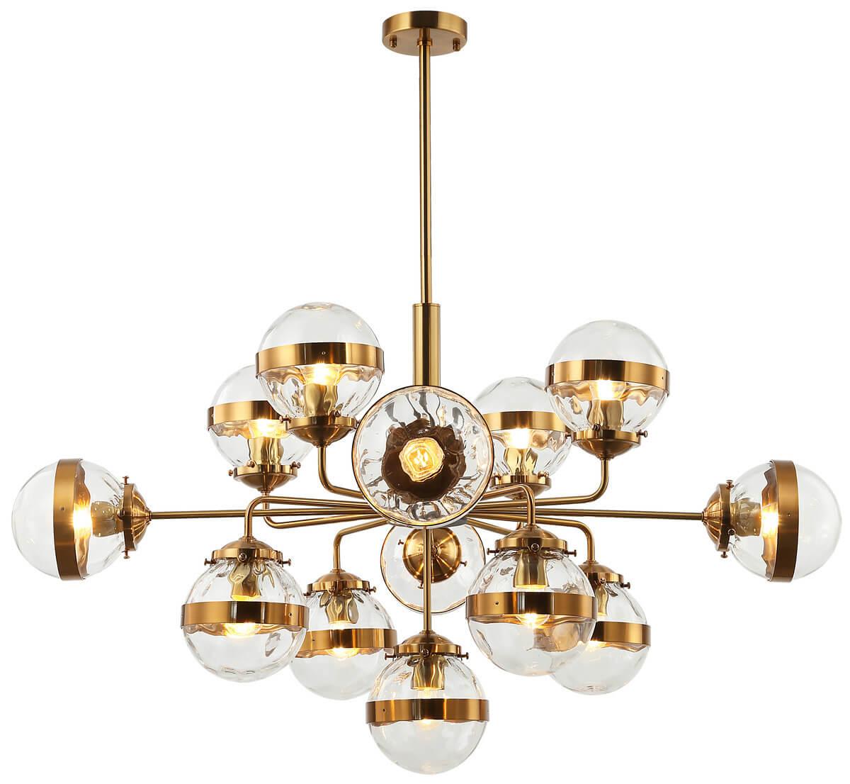 Производитель светильника рекомендует для устройства 13 ламп накаливания с цоколем E27 и мощностью 40 W, что позволит осветить помещение площадью 28 кв.м. Габариты изделия: высота – 1250 мм, диаметр – 1050 мм.