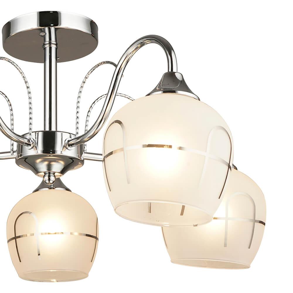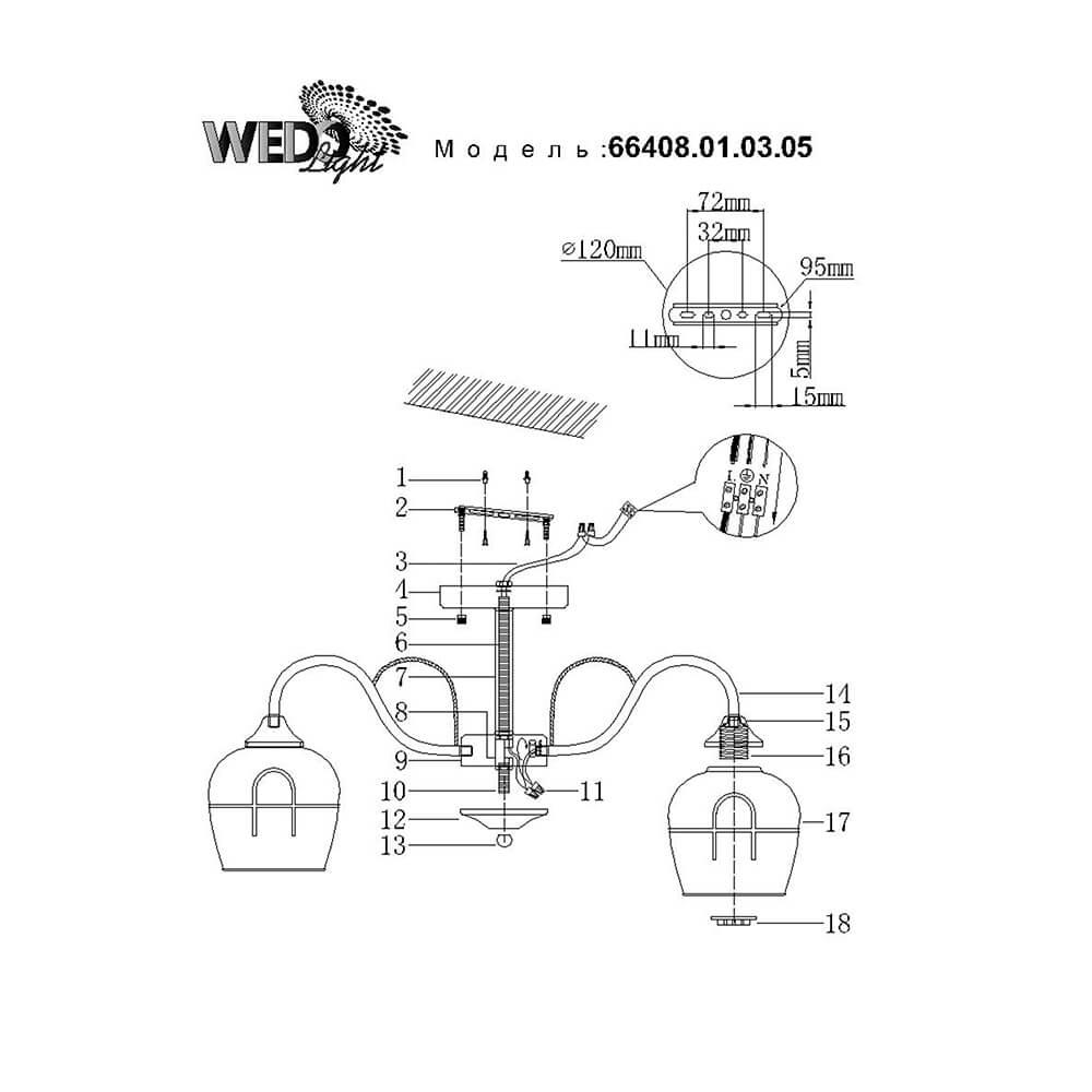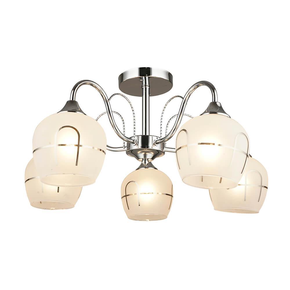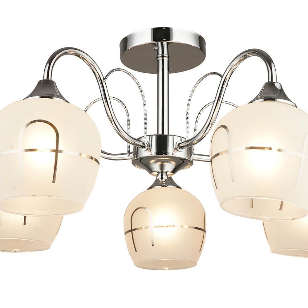 Производитель светильника рекомендует для устройства 5 ламп накаливания с цоколем E27 и мощностью 60 W, что позволит осветить помещение площадью 16,7 кв.м. Габариты изделия: высота – 270 мм, диаметр – 560 мм.
