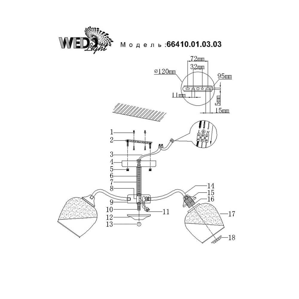 Производитель светильника рекомендует для устройства 3 лампы накаливания с цоколем E27 и мощностью 60 W, что позволит осветить помещение площадью 10 кв.м. Габариты изделия: высота – 270 мм, диаметр – 600 мм.