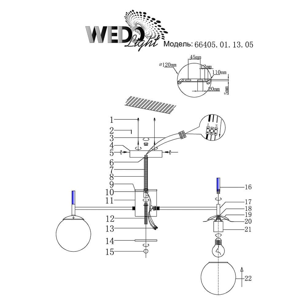 Производитель светильника рекомендует для устройства 5 ламп накаливания с цоколем E27 и мощностью 60 W, что позволит осветить помещение площадью 16,7 кв.м. Габариты изделия: высота – 370 мм, диаметр – 670 мм.