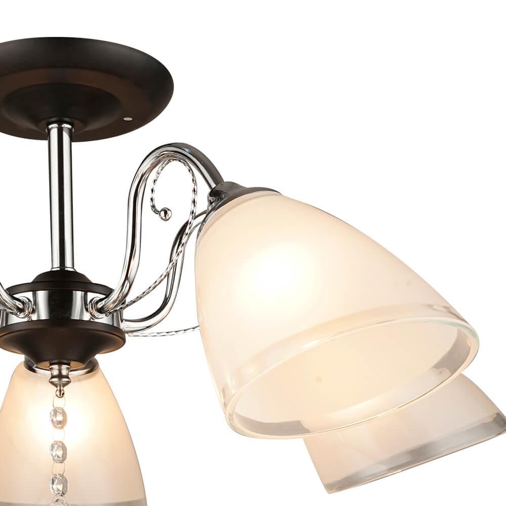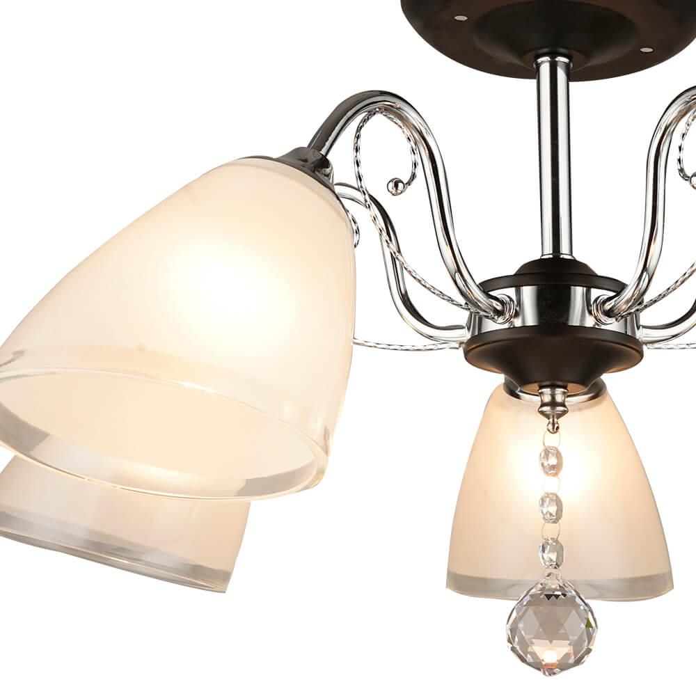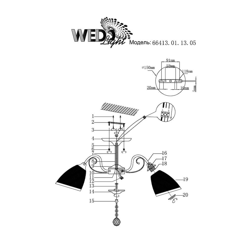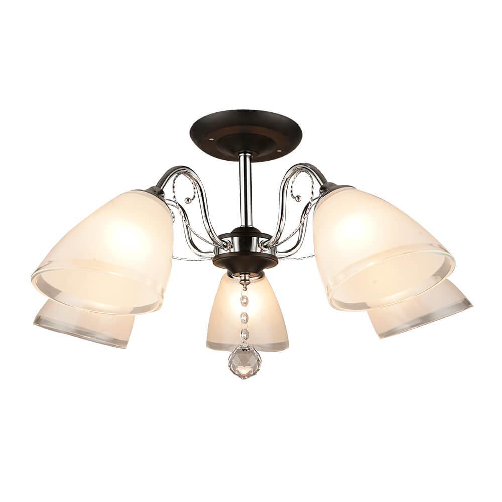 Производитель светильника рекомендует для устройства 5 ламп накаливания с цоколем E27 и мощностью 60 W, что позволит осветить помещение площадью 16,7 кв.м. Габариты изделия: высота – 325 мм, диаметр – 615 мм.