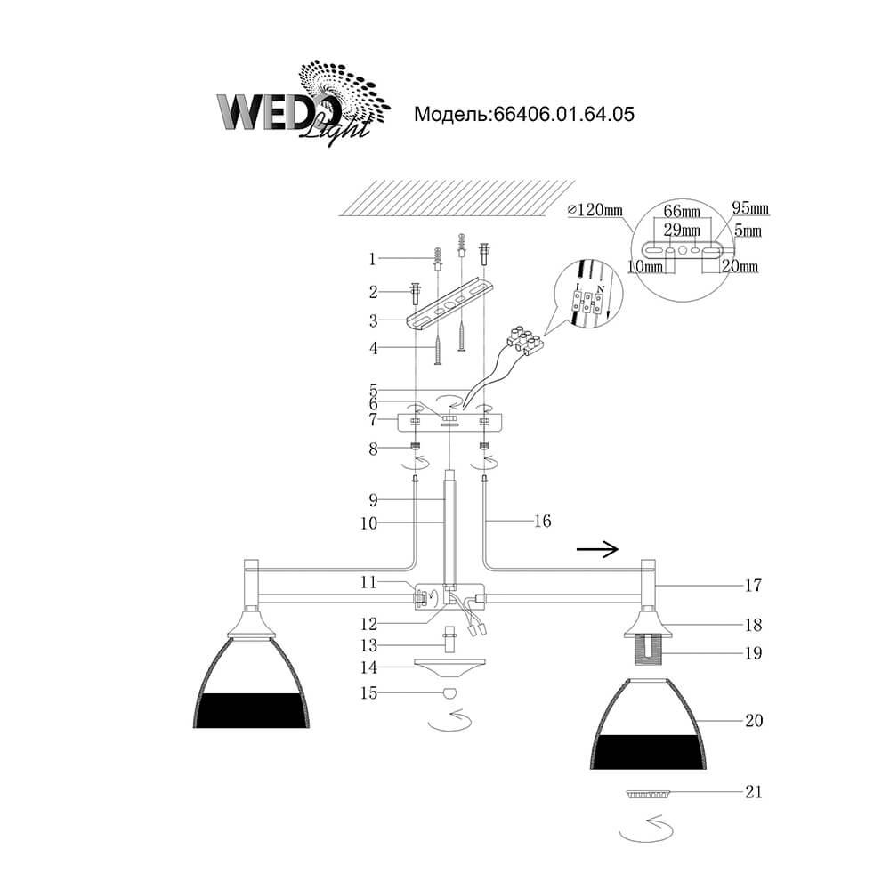 Производитель светильника рекомендует для устройства 5 ламп накаливания с цоколем E27 и мощностью 60 W, что позволит осветить помещение площадью 16,7 кв.м. Габариты изделия: высота – 300 мм, диаметр – 600 мм.