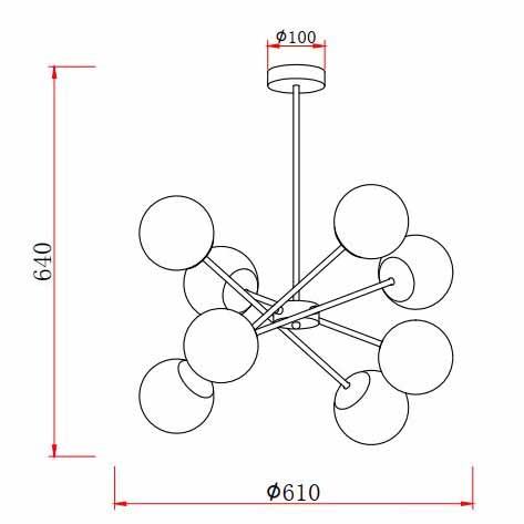 Производитель светильника рекомендует для устройства 8 ламп накаливания с цоколем E14 и мощностью 40 W, что позволит осветить помещение площадью 17,8 кв.м. Габариты изделия: высота – 640 мм, диаметр – 610 мм.