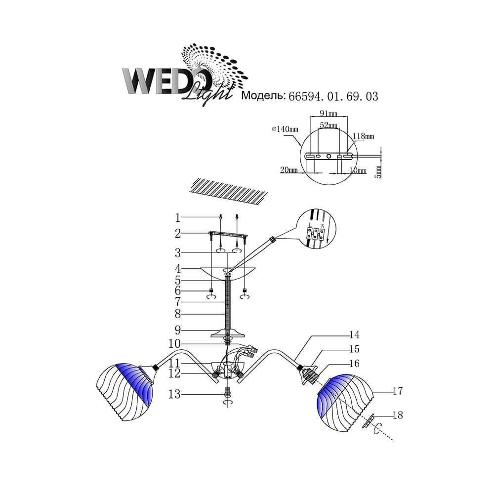 Производитель светильника рекомендует для устройства 3 лампы накаливания с цоколем E27 и мощностью 60 W, что позволит осветить помещение площадью 10 кв.м. Габариты изделия: высота – 300 мм, диаметр – 640 мм.