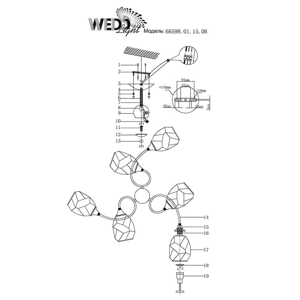 Производитель светильника рекомендует для устройства 6 ламп накаливания с цоколем E27 и мощностью 60 W, что позволит осветить помещение площадью 20 кв.м. Габариты изделия: высота – 270 мм, диаметр – 790 мм.