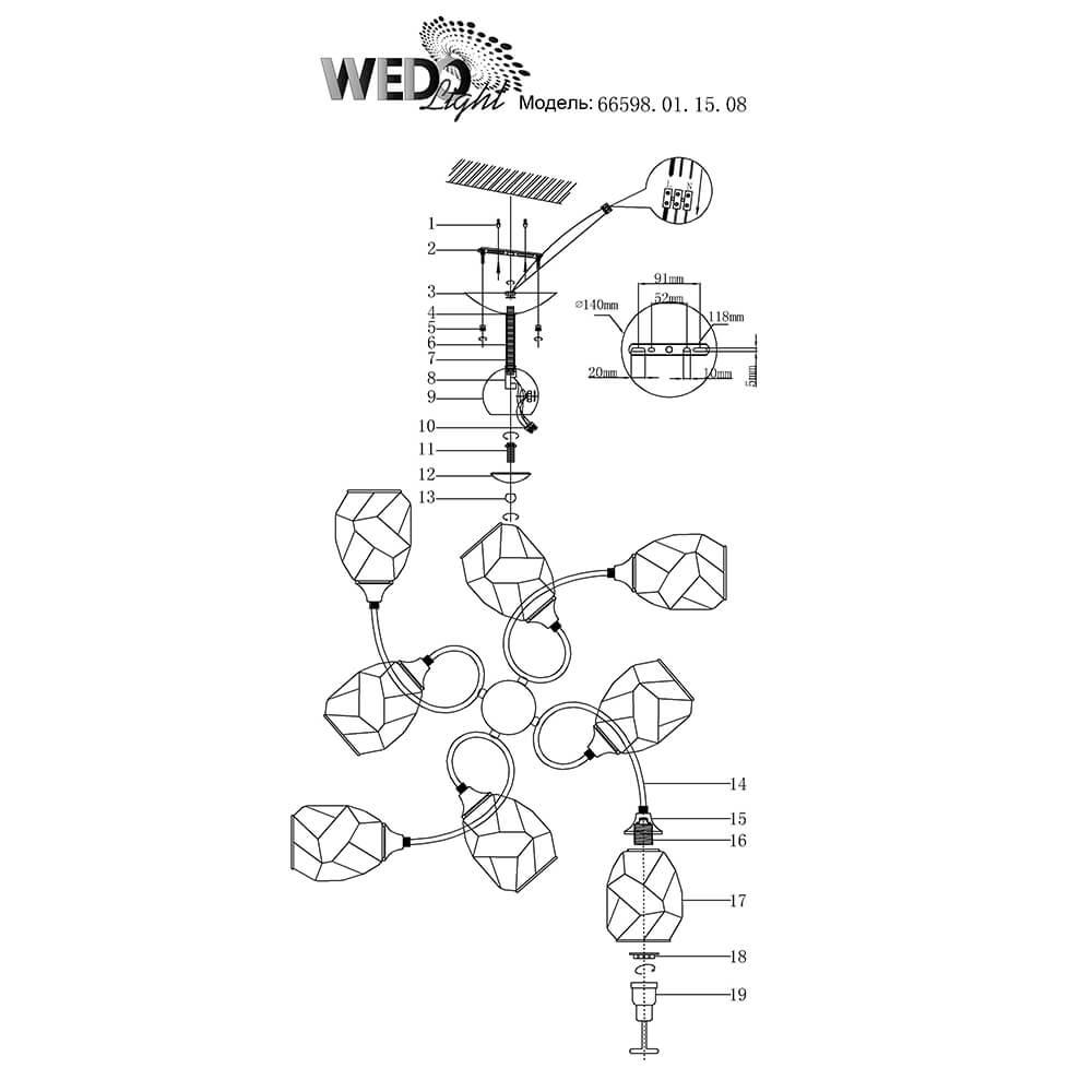 Производитель светильника рекомендует для устройства 8 ламп накаливания с цоколем E27 и мощностью 60 W, что позволит осветить помещение площадью 26,7 кв.м. Габариты изделия: высота – 290 мм, диаметр – 790 мм.