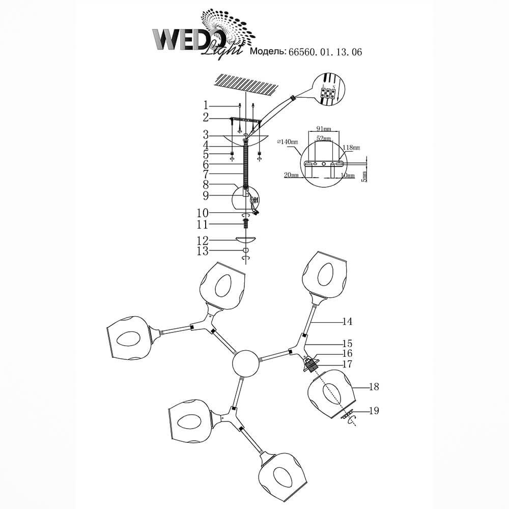 Производитель светильника рекомендует для устройства 6 ламп накаливания с цоколем E27 и мощностью 60 W, что позволит осветить помещение площадью 20 кв.м. Габариты изделия: высота – 320 мм, диаметр – 860 мм.