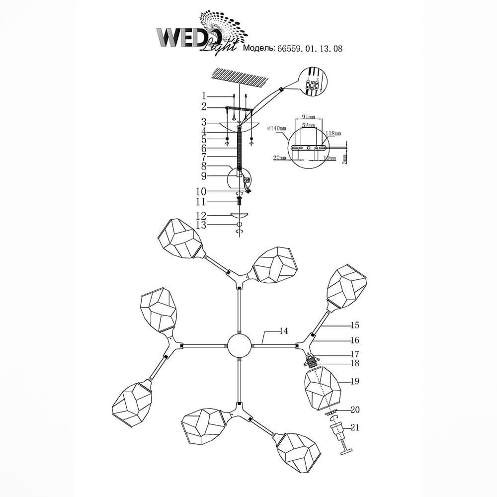 Производитель светильника рекомендует для устройства 8 ламп накаливания с цоколем E27 и мощностью 60 W, что позволит осветить помещение площадью 26,7 кв.м. Габариты изделия: высота – 320 мм, диаметр – 950 мм.