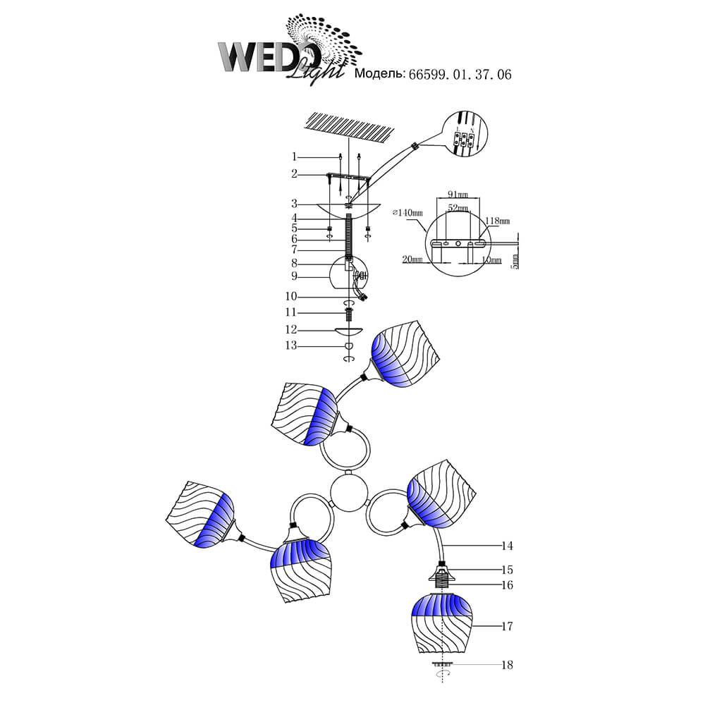Производитель светильника рекомендует для устройства 6 ламп накаливания с цоколем E27 и мощностью 60 W, что позволит осветить помещение площадью 20 кв.м. Габариты изделия: высота – 290 мм, диаметр – 790 мм.