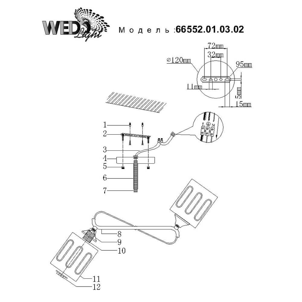 Производитель светильника рекомендует для устройства 2 лампы накаливания с цоколем E27 и мощностью 60 W, что позволит осветить помещение площадью 6,7 кв.м. Габариты изделия: высота – 260 мм, диаметр – мм.
