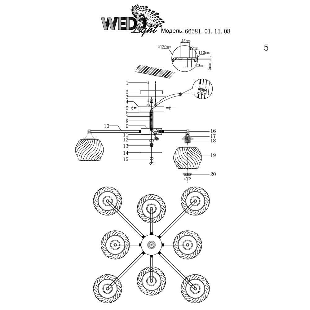 Производитель светильника рекомендует для устройства 8 ламп накаливания с цоколем E27 и мощностью 60 W, что позволит осветить помещение площадью 26,7 кв.м. Габариты изделия: высота – 305 мм, диаметр – 730 мм.