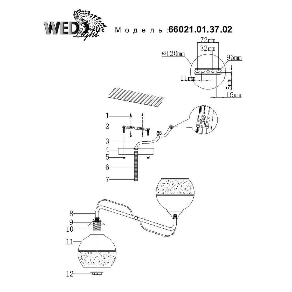 Производитель светильника рекомендует для устройства 2 лампы накаливания с цоколем E27 и мощностью 60 W, что позволит осветить помещение площадью 6.7 кв.м. Габариты изделия: высота – 230 мм, диаметр – мм.