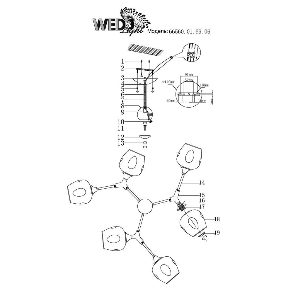Производитель светильника рекомендует для устройства 6 ламп накаливания с цоколем E27 и мощностью 60 W, что позволит осветить помещение площадью 20 кв.м. Габариты изделия: высота – 320 мм, диаметр – 860 мм.
