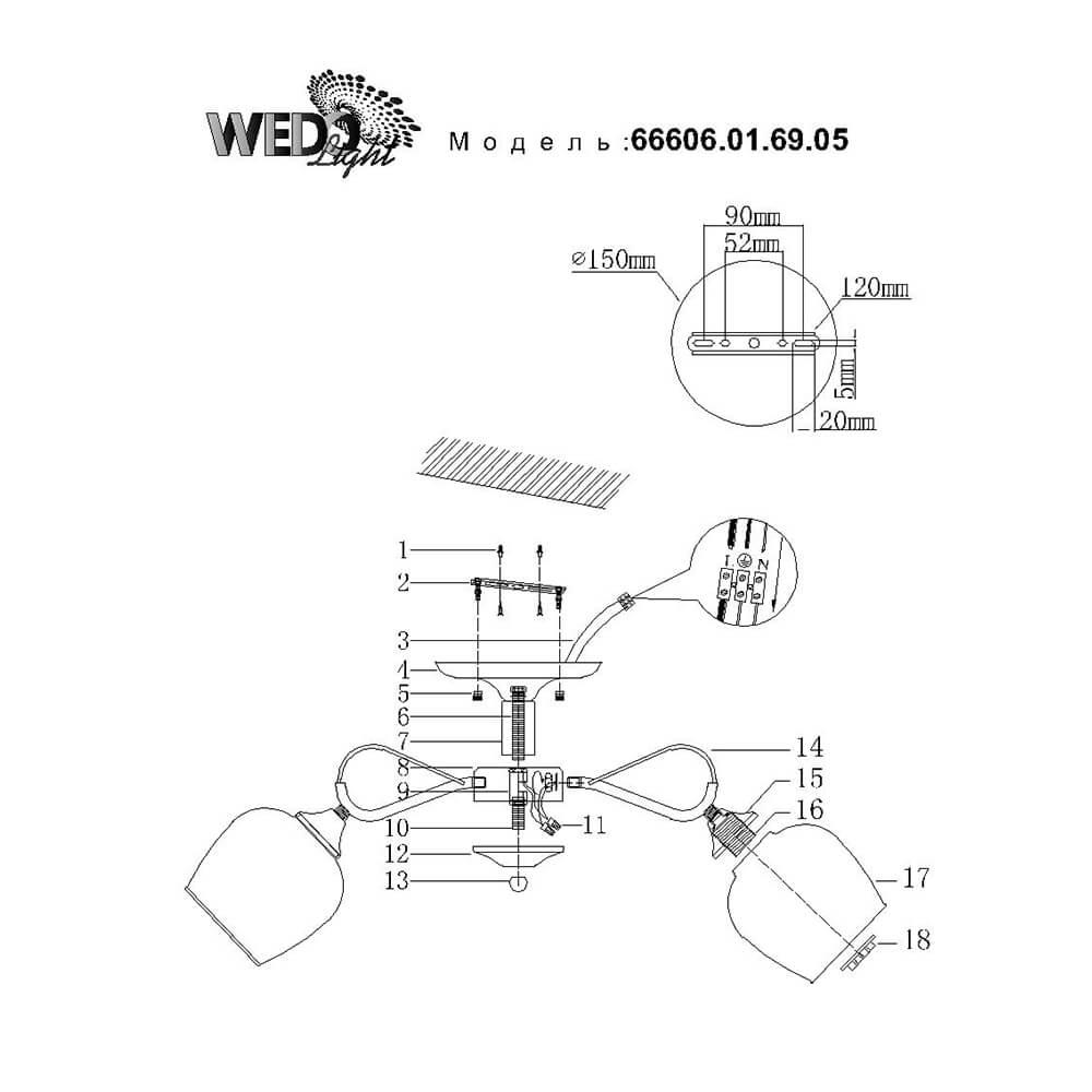 Производитель светильника рекомендует для устройства 5 ламп накаливания с цоколем E27 и мощностью 60 W, что позволит осветить помещение площадью 16,7 кв.м. Габариты изделия: высота – 260 мм, диаметр – 600 мм.